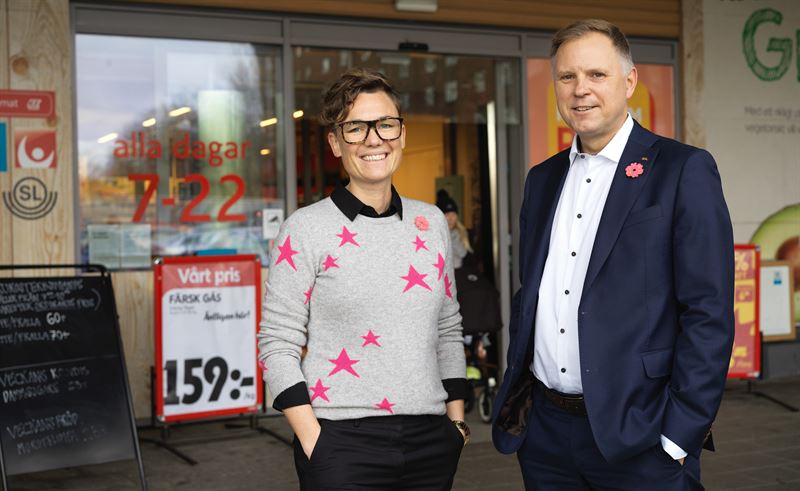 “Som ICA-handlare finns vi mitt i samhället och upplever just nu en ökande press på utsatta grupper och inte minst barnfamiljer på grund av pandemin. Det engagemang Majblomman visar lokalsamhället ligger väldigt nära vår egen historia och värdegrund och att stötta deras viktiga arbete känns rätt på alla sätt”, säger Magnus Moberg, ordförande i ICA-handlarnas Förbund, på bilden med ordförande i Majblommans lokalförening i Stockholm, Mathilda Westerman.